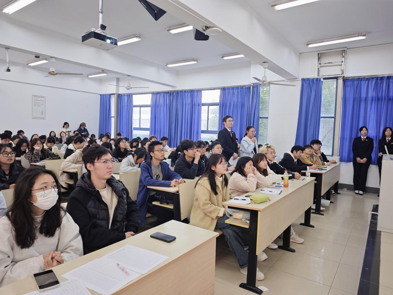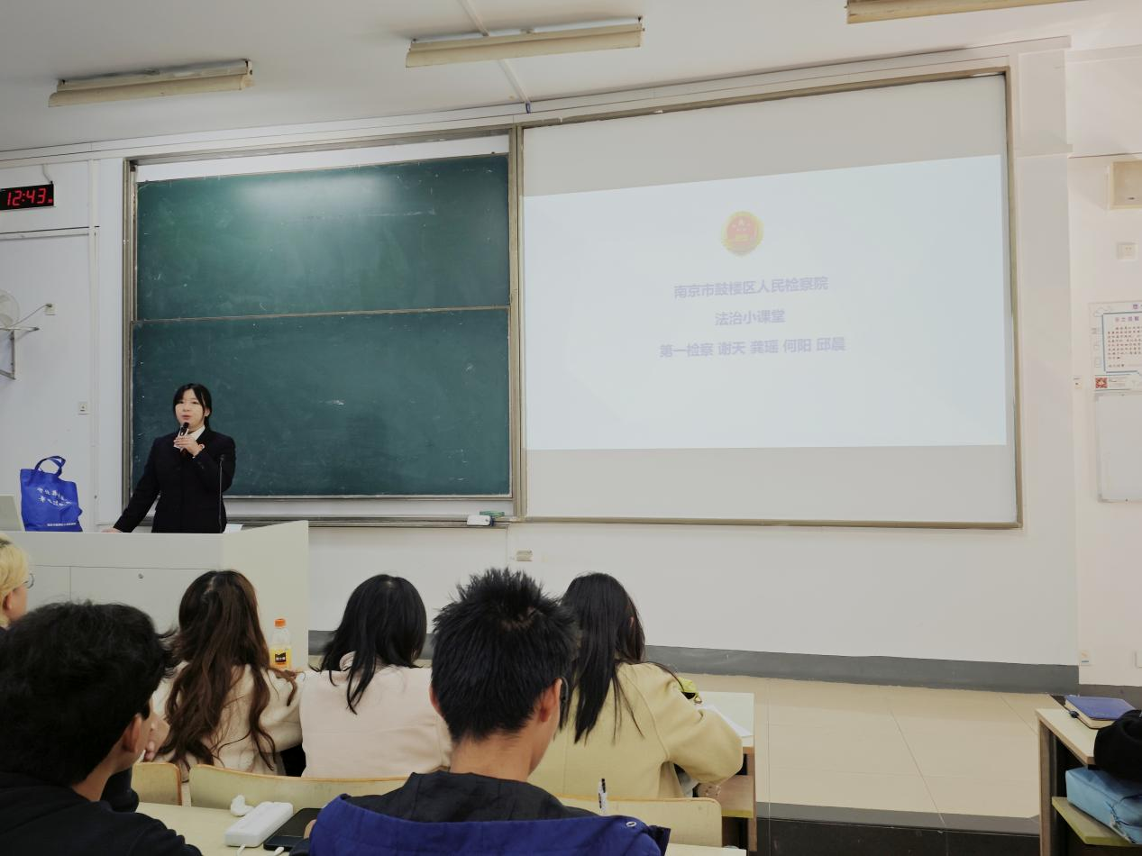 2025年11月14日,南京邮电大学第二百一十八期大学生菁英人才学校暨经济学院骨干培训班第十二次授课在教2-203顺利举行。本次课程特邀南京市鼓楼区人民检察院谢天、龚瑶、何阳、邱晨四位检察干警联袂主讲,课程主题为“法律与人生——迈向成年世界的必备法则”。